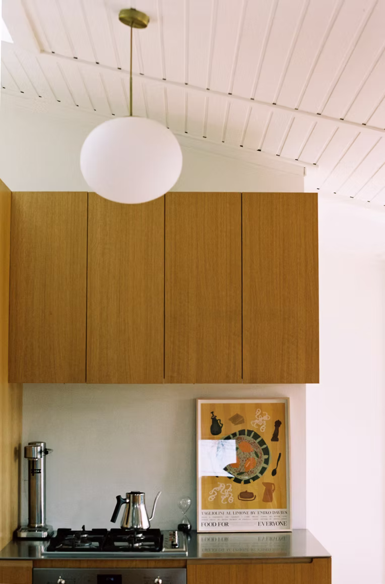 Crafted with a refined palette of American white oak and solid stainless steel, the kitchen is simple and hard wearing, yet quietly understated, with a bespoke coffee station serving as the heart of daily rituals. The adjacent dining area was thoughtfully redesigned to provide an inviting space for intimate gatherings. Its connection with the bush-lined views of Brooklyn and the western setting sun made obvious through the installation of large sliding doors, allowing an easy transition between in and out, and inviting natural light and openness into the home.